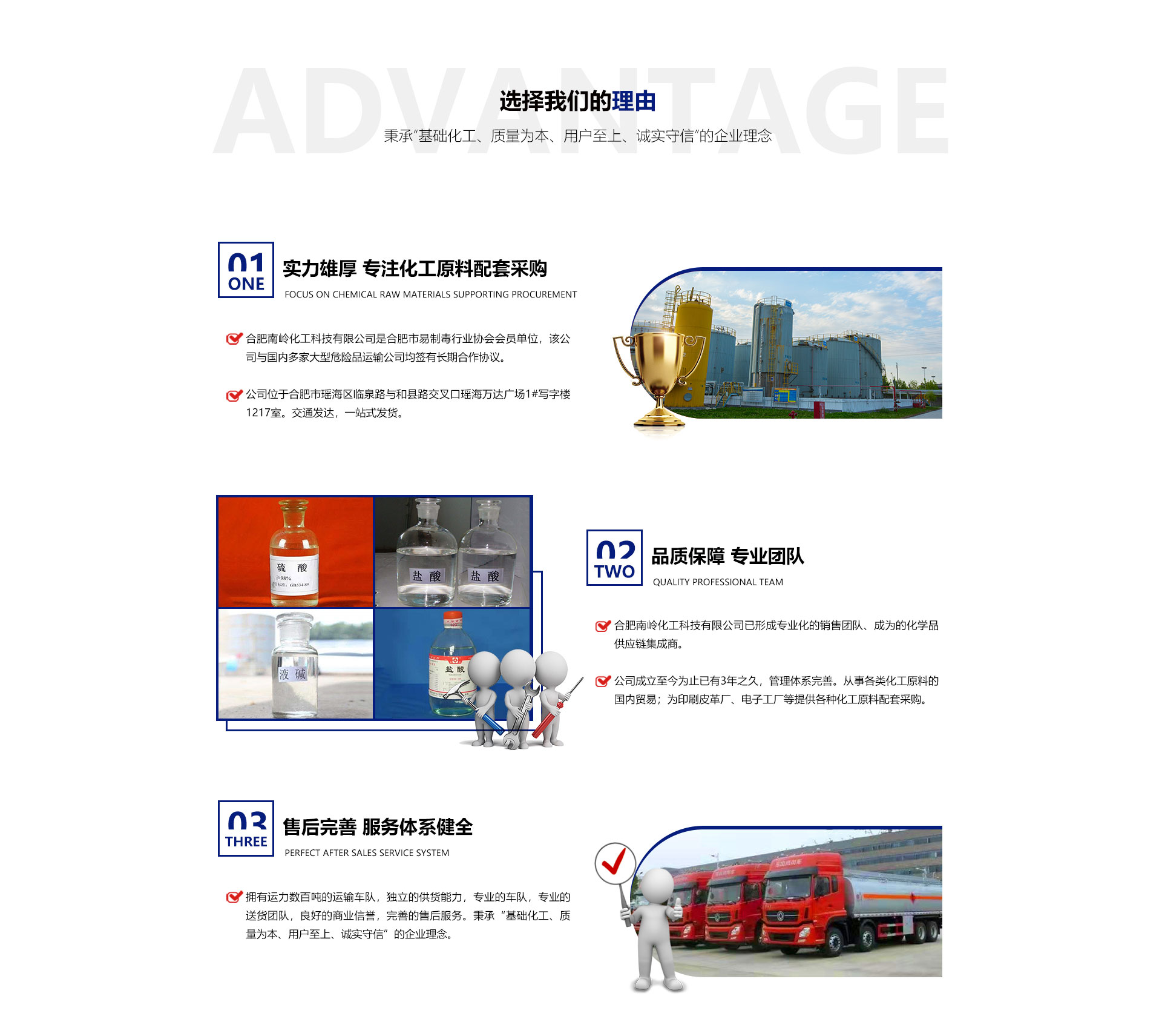 關(guān)于我們合肥南嶺化工科技有限公司是合肥市易制毒行業(yè)協(xié)會會員單位,該公司與國內(nèi)多家大型危險品運輸公司均簽有長期合作協(xié)議,擁有運力數(shù)百噸的運輸車隊,獨立的供貨能力,良好的車隊運輸,有效的送貨團隊,良好的商業(yè)信譽,完善的售后服務(wù)。秉承“基礎(chǔ)化工、質(zhì)量為本、用戶至上、誠實守信”的企業(yè)理念。從事各類化工原料的國內(nèi)貿(mào)易;為各個化工廠、印刷皮革廠、電子工廠等提供各種化工原料配套采購。目前,公司正朝著以貿(mào)易為基礎(chǔ)、以實業(yè)為依托,采購、銷售,內(nèi)外貿(mào)一體化,上下游一體化,具有綜合增值能力和復(fù)合競爭能力化工原料供應(yīng)商。本公司主要經(jīng)營的產(chǎn)品有:鹽酸、硫酸、液堿、片堿等。合肥南嶺化工科技有限公司已形成服務(wù),售后一體化的團隊、成為的化學品供應(yīng)鏈集成商。為客戶提供良好的服務(wù)及產(chǎn)品,本公司經(jīng)銷的各種產(chǎn)品不僅在安徽地區(qū)深受用戶好評,而且具有很高的市場占有率,產(chǎn)品行銷各個地區(qū)。